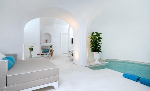 A perfect geometry and exotic-like atmosphere with some oriental details thanks to the exquisite majolica in the bathroom, which reminds of the pattern on the walls, and the niches in the living room that follow the decoration of the canopy in the bedroom.